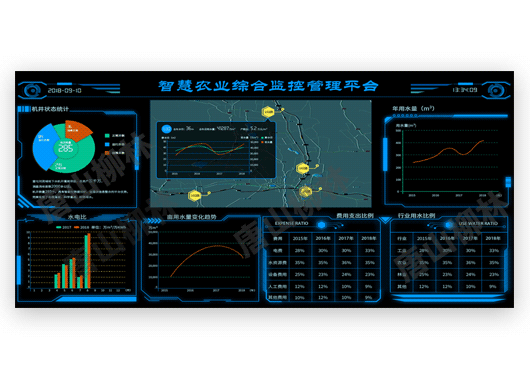 智慧農業管理平臺可實現“一張圖”展示對總用水量變化、費用支出、水電比、行業用水比、機井狀態等數據,總體掌握年用水量變化趨勢及費用支出比例,為管理決策提供數據支撐。